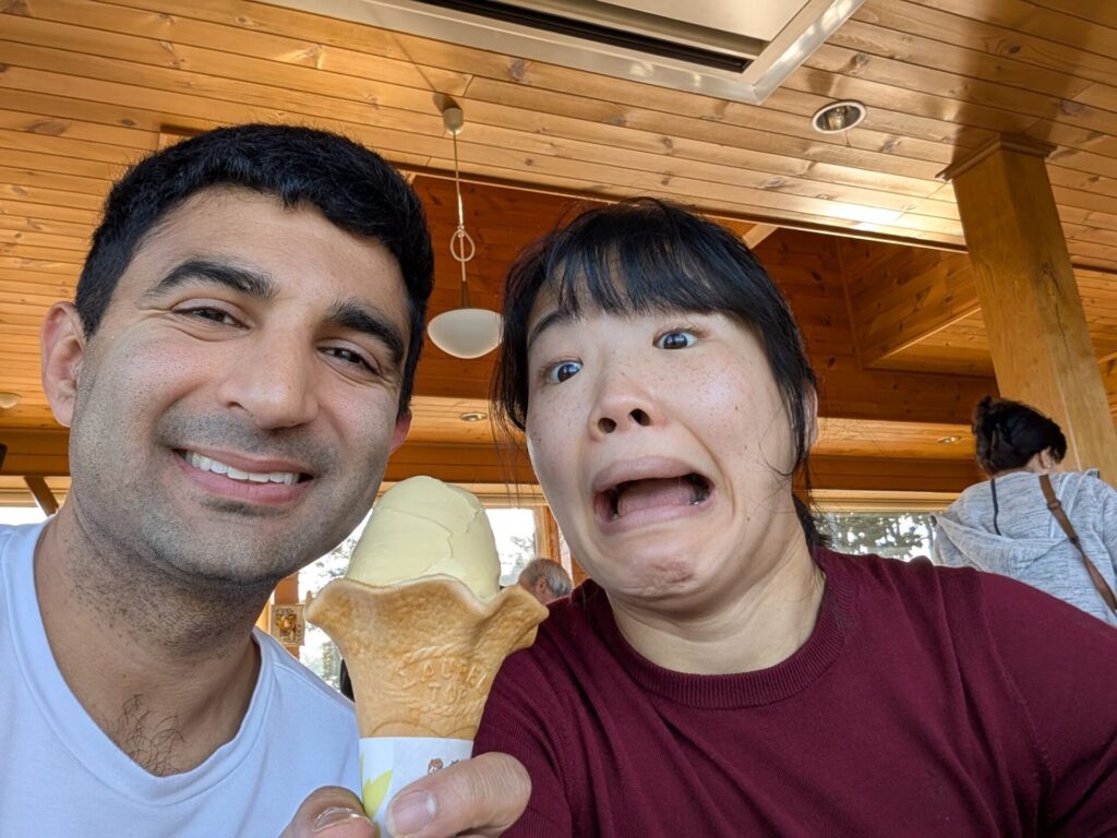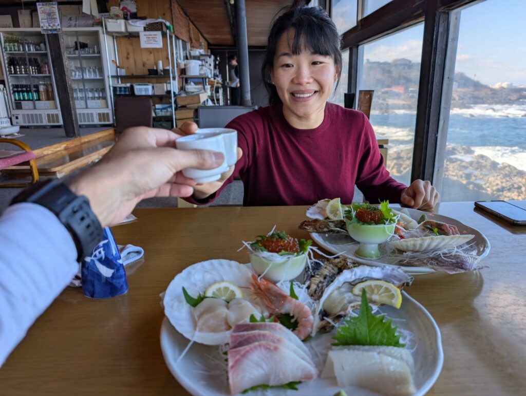 For Leanne’s 35th birthday, I took her on a birthday hike along the Shiokaze trail in Hachinohe, Japan. We hiked for hours, stopping for food at a sashimi restaurant where we literally saw the chef catching the food, banana flavored ice cream, and at every torri gate shrine we saw. We hiked along the beach, through forests, and along a huge natural lawn plain. The plan was to hike to the end, and then take a train back to start. Unlike every other train in Japan though, this one only went at 2pm and 6pm, and we got to the “station” (literally two chairs and an awning) at 3pm. Yikes! Luckily, a taxi company was able to rescue us.