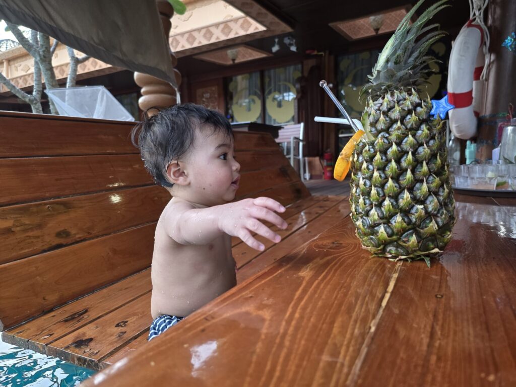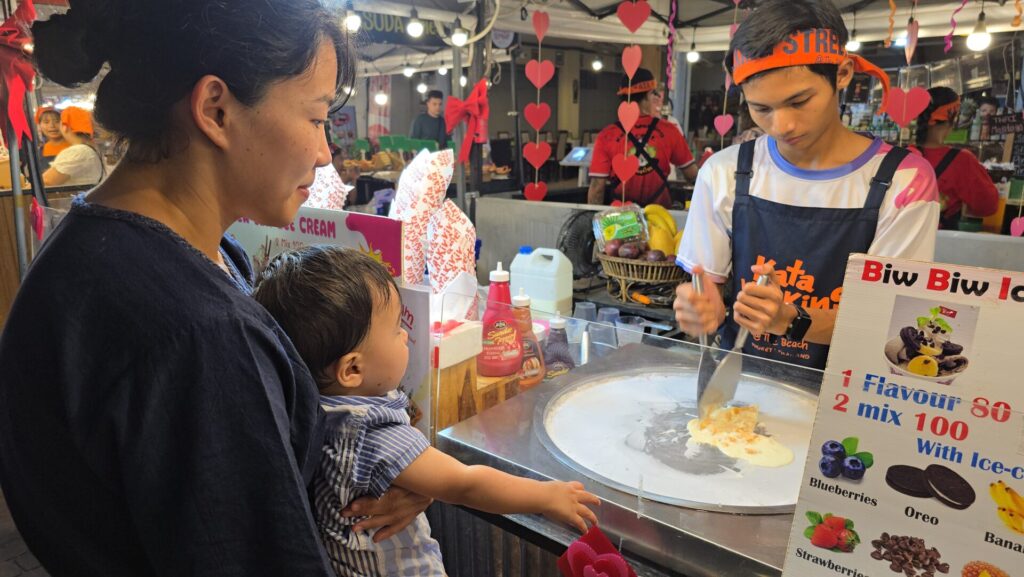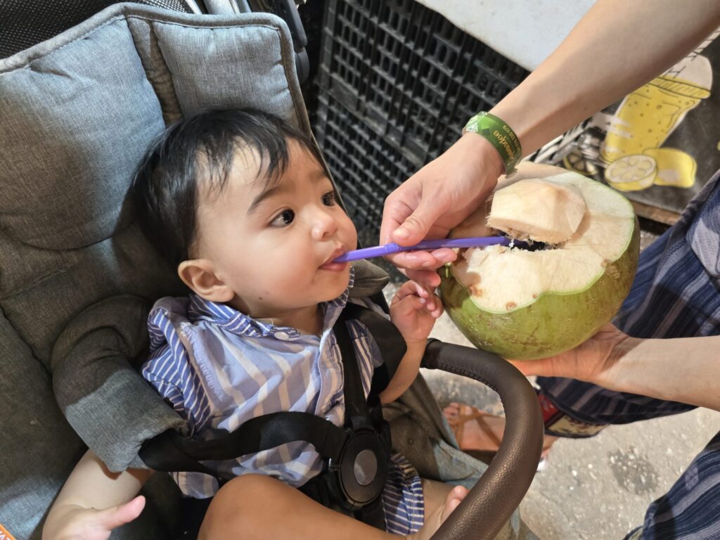 First day in Thailand! The place ride over Forrest did great! Landing in Thailand was so cool, but it is crazy how hot it is here! Coming from snowy Misawa, I was surprised to get out the airport to 90 degree weather. We checked into hotel in Bangkok, then we ate free food for happy hour, including a delicious papaya salad, chicken and pineapple, and so, so much fresh fruit. Watermelon, dragon fruit, passion fruit, cantaloupe, all you can eat. After that, we headed out to the local night market where clothes are so cheap! A soccer jersey for only $3? Even if it is a knockoff, that’s really cheap. Leanne got some flowy Thai pants she can wear at temples with an elephant print. We ate fresh coconut, fresh sugar cane juice, durian, beef with holy basil, and pudding with coconut milk and pulp. There is still so much to eat, but I’m sure I’ll get to experience so much more food tomorrow with the food tour. A surprising thing about Thailand is people are so free to touch your baby or play with your baby. Not at all like Japan or USA! The culture here is totally different.
